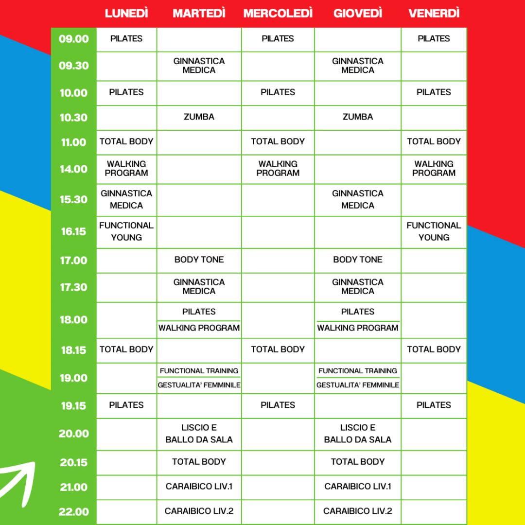 Nell’arco della giornata si susseguono diverse lezioni con varie finalità: i nostri corsi alternano attività rilassanti ad attività divertenti, allenamenti stimolanti a livello cardiocircolatorio ad allenamenti che stimolano lo sviluppo della massa magra.